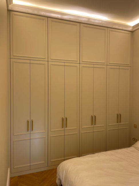 IKEA PAX wardrobes fitted to large space in bedroom; with bespoke doors, panels and trim made, sprayed and fitted to the units for a high-end finish. Due to the room having a tall ceiling, matching panels were fitted above the wardrobes, with the two middle panels made as doors, to allow some additional storage space above the wardrobes. All made components were given a high-quality sprayed paint finish using Farrow & Ball 'Joa's White' to match the surrounding walls in the room, with a matching coving fitted above the install to complete the built-in look.